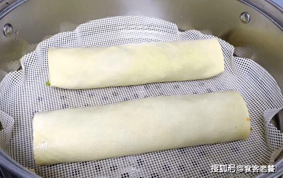 下面準備兩張豆皮,用開水燙一下,去除豆腥味,然後放在菜板上,把菠菜放在豆皮上鋪均勻,再從一邊卷起來,盡量卷的緊實一些。整好以後直接放入蒸鍋裡,蓋上蓋子,開大火,水開蒸十分鐘。