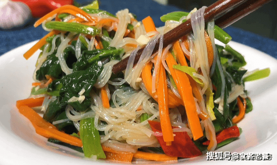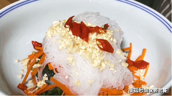一把大蒜拍扁後剁成蒜末,準備兩個辣椒剪成辣椒條,粉絲泡發好後剪成兩段。鍋中水燒開,把粉絲放入鍋中焯水三分鐘,之後撈出再放入冷水中過涼。鍋中水再次燒開,再把菠菜倒入鍋中焯水一分鐘,時間到瞭撈出過涼。之後鍋中放入蘿卜絲,水開以後,把胡蘿卜絲撈出來,攥幹水分後全部放入盤中,把蒜末、辣椒段放進來。