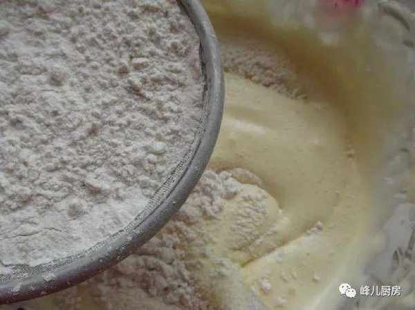 4、向打好的蛋糊中篩入低筋面粉,面粉最好分兩次篩入,將第一次的面糊拌勻之後,再篩入第二次面粉,用橡皮刮刀以從底部向上翻拌的形式,將面粉和蛋糊徹底拌勻。