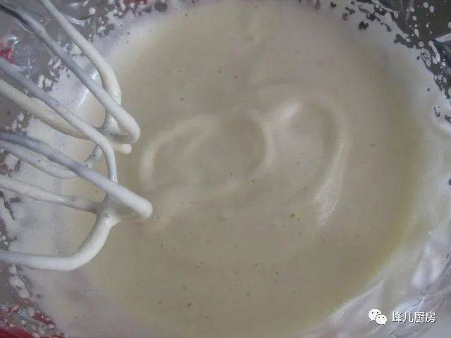 3、用打蛋器打發,先用低速攪拌,形成細膩的乳沫以後,換高速攪拌,直至將雞蛋打發到非常濃稠的狀態,提起打蛋器時,滴落的蛋糊可以在蛋糊表面劃出花紋,花紋維持較長時間不會消失,打蛋頭上保持有2~3㎝的蛋糊不會滴落。
