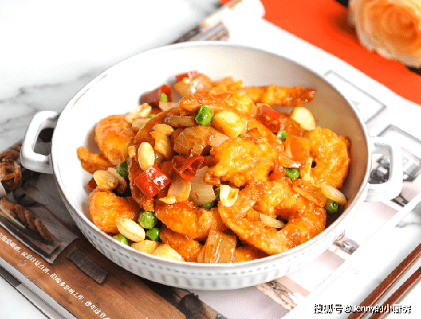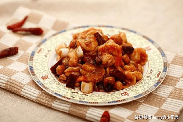 最後倒入蝦仁、紅椒、油炸花生米,快速翻炒均勻,這道菜就做好瞭。