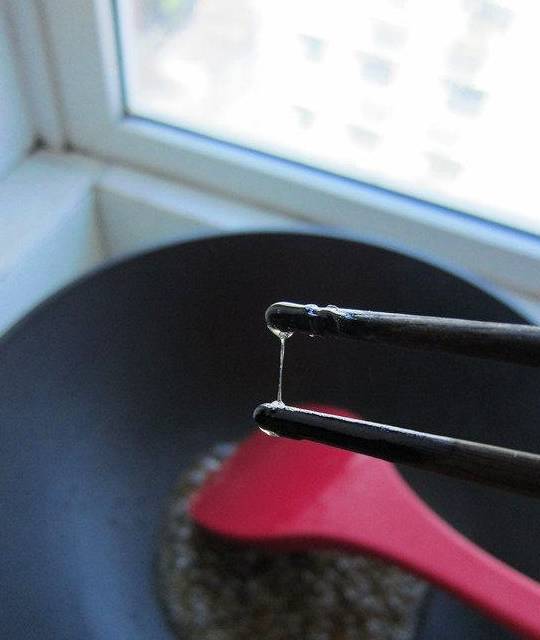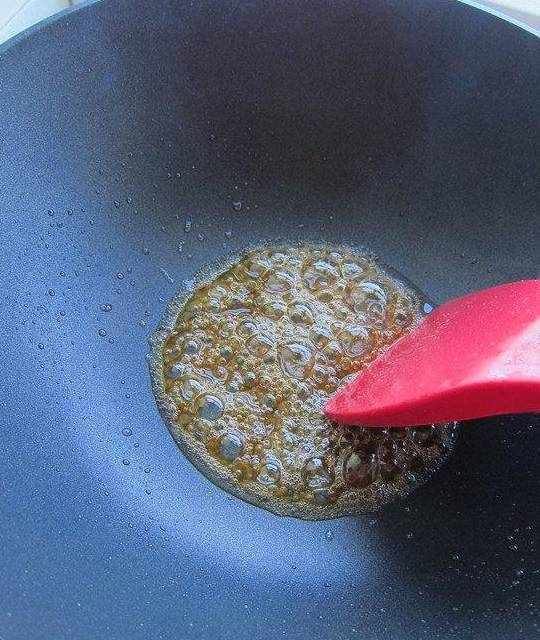 7.糖稀顏色開始變深質地變稠,呈淺麥芽糖色,用筷子蘸一點,等待一會再把筷子打開,能拉成糖絲