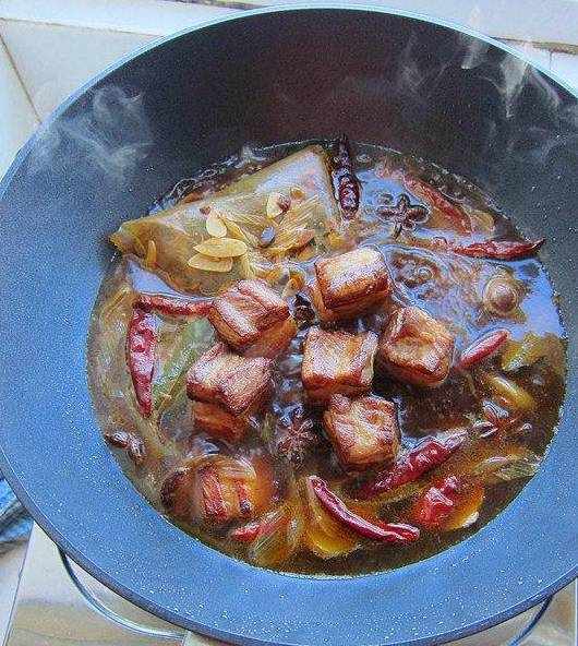 16.放入大料和幹辣椒,將五花肉塊整齊碼放在上面,肉皮朝下,再放入適量的鹽、料酒、少許豆瓣、適量的糖色,少量紅燒肉醬油,最後倒入熱水剛好沒過五花肉為宜