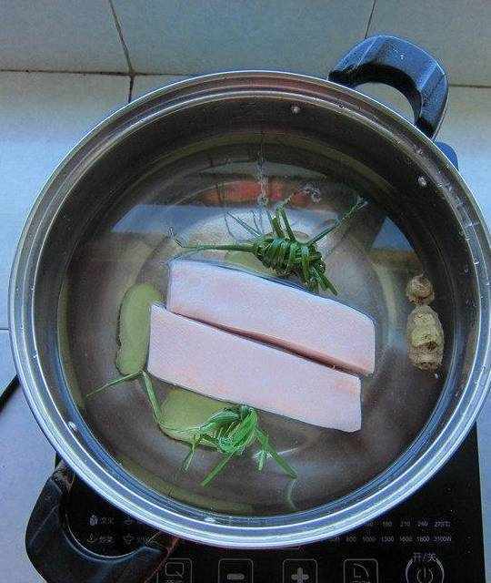 11.置一鍋冷水,入蔥結、薑片、少許料酒,放入五花腩肉,肉皮朝上,水開後撇去浮沫,轉中火煮15分鐘