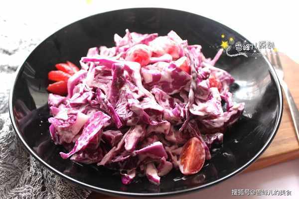 紫甘藍沙拉的做法:材料:紫甘藍,聖女果,沙拉醬,青檸汁。