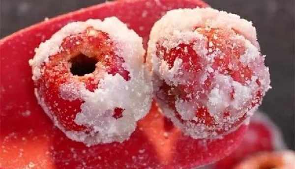 2.這是我們已經洗幹凈,而且將山楂籽也去掉瞭,然後用廚房用紙將它表面的水分擦幹,或者是直接放著瀝幹。這個一定要瀝幹水分,沒瀝幹水分的話不容易掛霜;