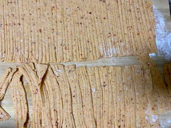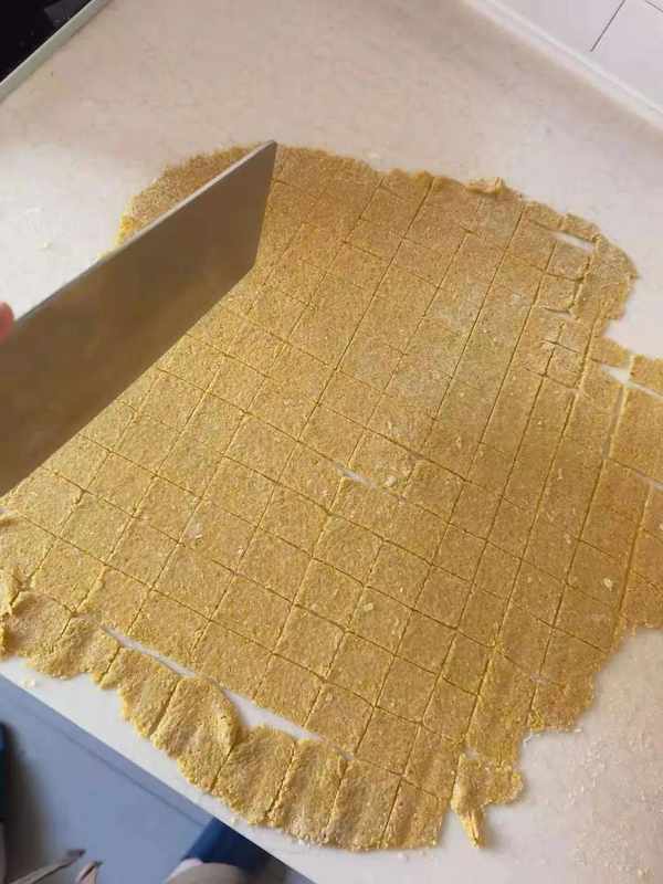 3、面團搟成薄片,切成方形,可以再用叉子插出均勻小孔。