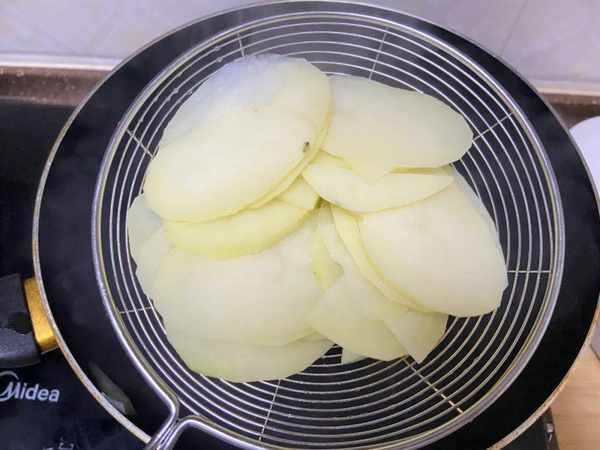 2、水燒開,放入土豆片煮1-2分鐘,土豆片漂起來就差不多,不要煮過瞭,糯瞭就不好吃瞭,最後把土豆撈出放入冰水再瀝幹。
