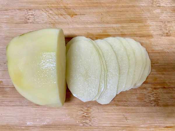 1、土豆去皮切薄片,用清水沖洗掉表面的淀粉。