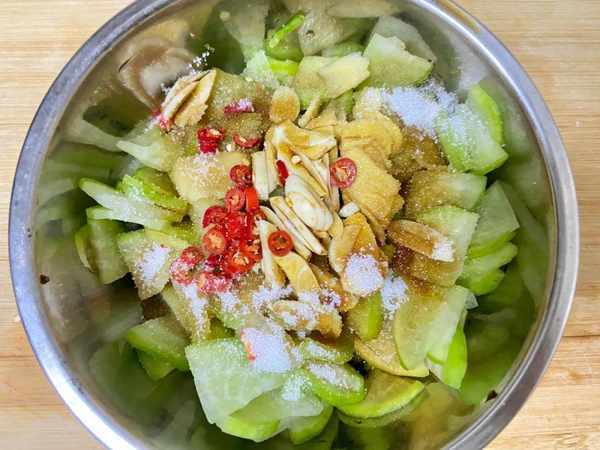 3、擠幹的蘿卜裝入碗中放入切好的小米辣蒜薑片。