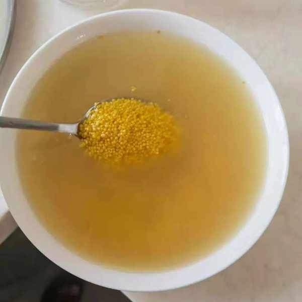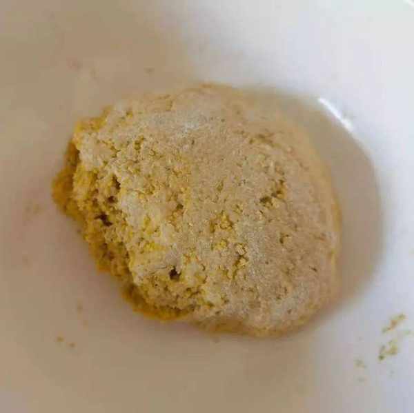 2、倒出大部分清水(註意不要全部倒完),泡好的小米加入100g面粉中用筷子攪拌成絮狀後,用手和成光滑面團。