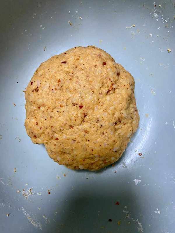 1、剩米飯倒入盆內,加入30g玉米淀粉、50g面粉、鹽、辣椒粉、五香粉,攪拌均勻後搓成面團,根據米飯狀態決定要不要加水,如果要加采用少量多次。