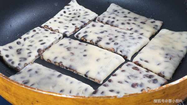 10、平底鍋預熱刷油,薄薄的一層就行,放入紅豆餅,表面再薄薄的刷一層油防止風幹,中火煎2分鐘後翻面,繼續煎2分鐘就可以出鍋瞭;