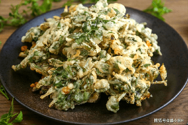 4、花椒葉放進雞蛋糊碗裡拌勻。