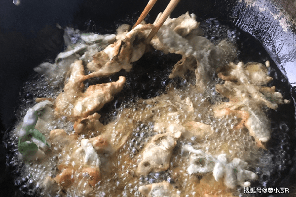 5、熱鍋倒油四五層油溫,調中小火,用筷子逐個下入油鍋,先炸的先出鍋,炸至花椒葉稍變色即可。