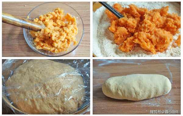 3、然後就可以上手揉面瞭,加瞭紅薯泥的面團會不太好揉,我們可以給它放一邊醒5分鐘後再揉,這樣面團就好揉多瞭,我們現在就可以將面團揉光滑瞭,揉的時候可以一邊揉,一邊戧點幹面粉,大概揉成像這種軟硬適中的程度就可以瞭;