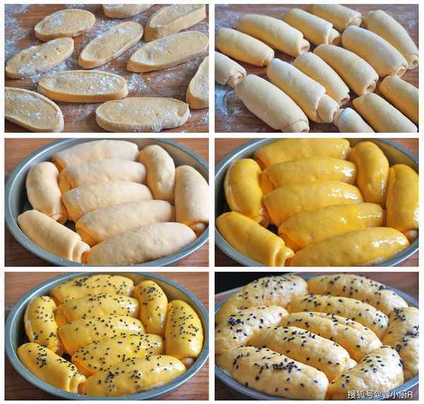 6、卷好後註意要用保鮮膜蓋一下,避免表面風幹,全部做好蓋上保鮮膜2次醒發30分鐘,二次醒發地面吃起來口感會更加細膩,面醒發好後我們準備一個模具,底部刷上食用油,然後把面團放進去,表面再刷上一層蛋黃液,撒上少許的黑芝麻,吃起來會更香;