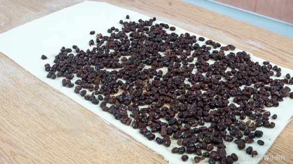 6、現在把蜜紅豆鋪上來,鋪滿面片的三分之二,盡量鋪均勻整齊;