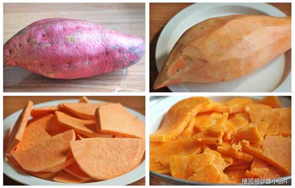 1、首先準備一個紅薯,我們先把它去皮。然後切成小塊裝入盤中,直接上鍋蒸熟就可以瞭,大火蒸的話,10分鐘左右就能完全熟透,我們現在將紅薯取出來倒入碗中,趁熱加20克白糖,然後搗成紅薯泥後放涼備用;