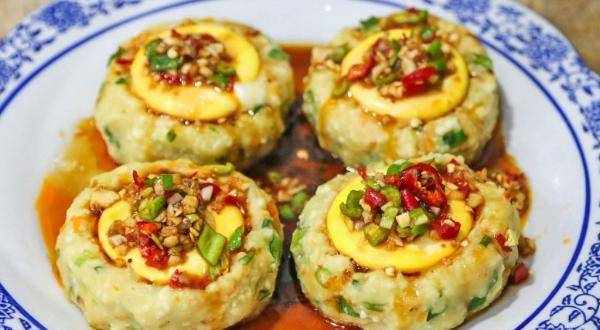3.準備4個雞蛋,隻取蛋黃,把蛋黃一個一個地倒入豆腐窩中備用。蒸鍋中燒水,水燒開後,放入豆腐和雞蛋,蓋上鍋蓋,開大火蒸10分鐘。