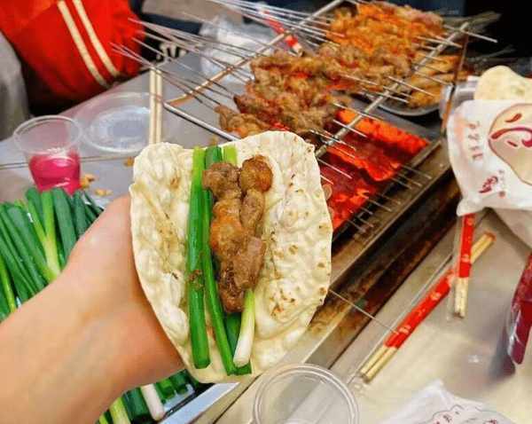 而且在淄博吃燒烤,每張桌子都會配備一個小爐子,可以自己拿著肉串烤,很有參與感,烤好之後把小餅折疊蘸料,再放上肉串,最後配上小蔥卷著吃,吃起來非常滿足,口感也很好,也不會感覺肉串很膩。