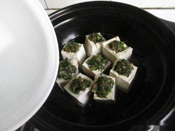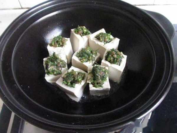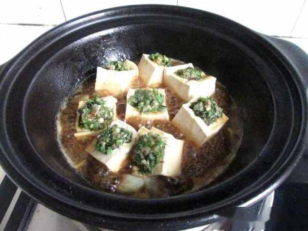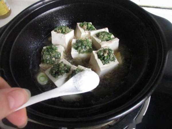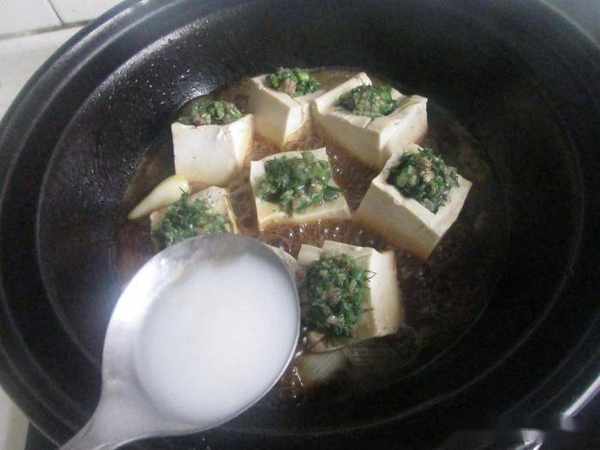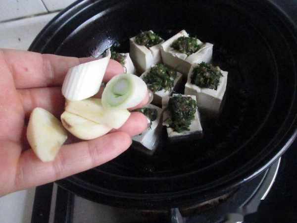 8,砂鍋裏放入油,放入豆腐箱子小火煎約3分鐘。