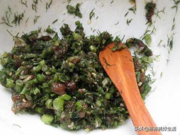 1,肉餡加入葱薑末,醬油,鹽拌勻,再加入切碎的茴香,加入花生油拌勻。
