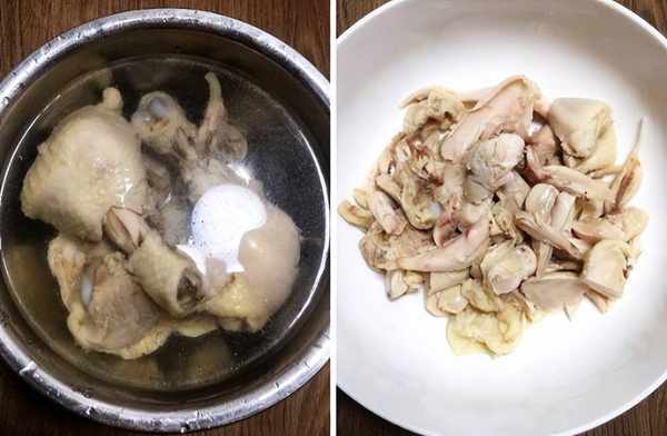 取出煮好的雞肉放涼,用手撕成絲狀。準備半個檸檬,把檸檬汁擠出來備用。將青蔥洗凈切成絲狀。在碗裡加入適量鹽和黑胡椒粉,加入適量的檸檬汁進行調味。