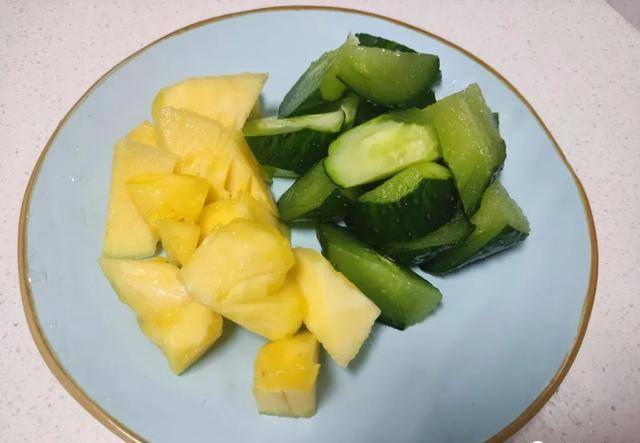 2.黃瓜跟菠蘿處理幹凈,菠蘿切塊,然後也要切滾刀狀,放在盆中備用;