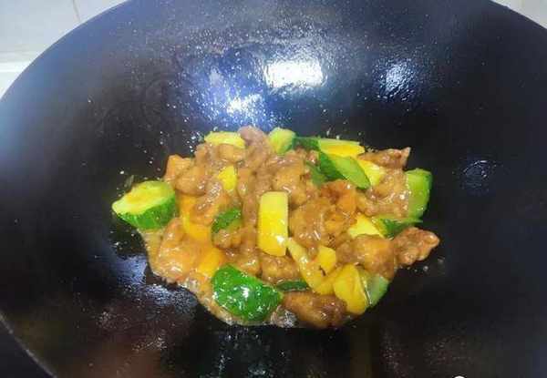 5.食材燜煮好後,把黃瓜放入裡面,炒均勻,收汁即可出鍋瞭。