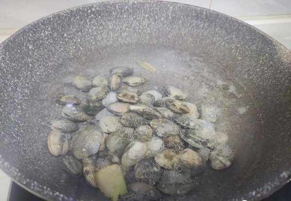 2.鍋內倒入水,生薑片,還有花蛤也放入裡面。食材下鍋煮開,水開會有浮沫,我們要用勺子撈出;
