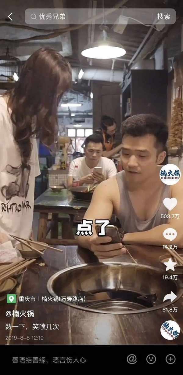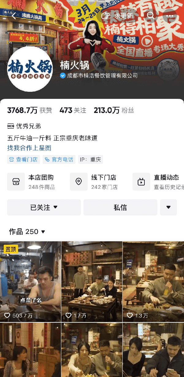 同時,官方在日常內容運營,以持續的“火鍋短劇情”、“創始人故事”、“門店經營動態和火鍋店日常”為主要更新內容;搭配在抖音生活服務,不同地區CPS達人合作模式助力下,關聯楠火鍋團購產品POI的短視頻內容,得到瞭更精準推送,配合到店的消費場景露出,品牌門店環境被直接看到,帶有本土川渝的特色的短視頻內容,關於楠火鍋的網紅經營故事,經營動態,員工特點也在平臺的傳播中,得以被更多人看到,實現從產品到品牌的消費心智深植。