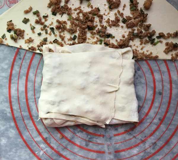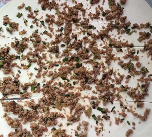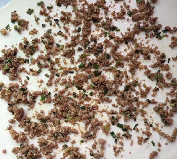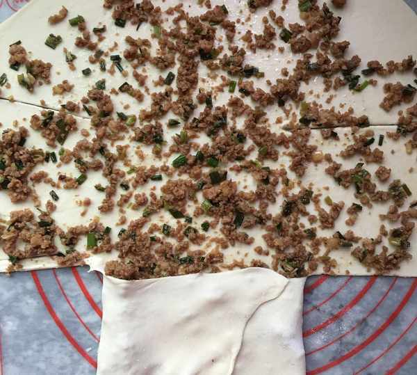 2,劑子搟薄,鋪上肉餡並攤勻。