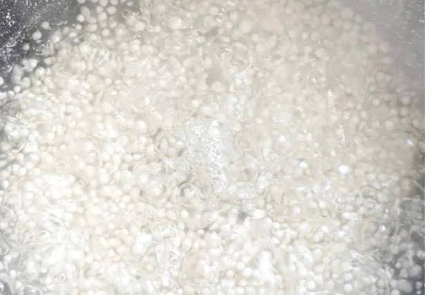 第二步:首先大鍋燒一鍋開水,然後倒入西米,煮至西米剩下一點白心的時候關火再燜30分鐘,中途需要攪拌攪拌,不然容易粘鍋喲