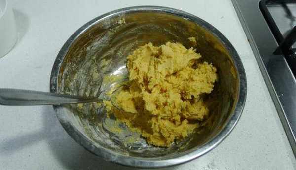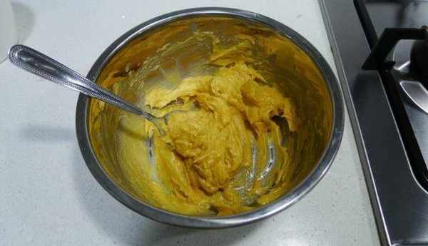 步驟3然後將在室溫軟化後的黃油和鹽攪拌均勻,由於裡面還要加泡打粉,所以不需要把黃油打發。接著倒入焦糖液繼續攪勻
