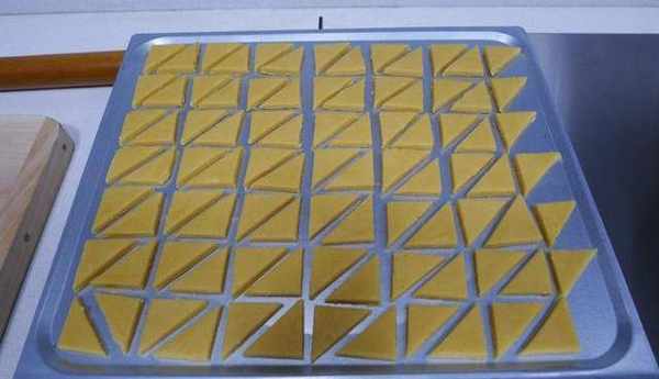 步驟6用刀切成大小均勻的三角形或者用模具印出其它造型後放在烤盤上,中間要留出一定距離。然後放入預熱到170℃的烤箱中烤到餅幹變成棕色就完成瞭