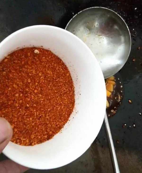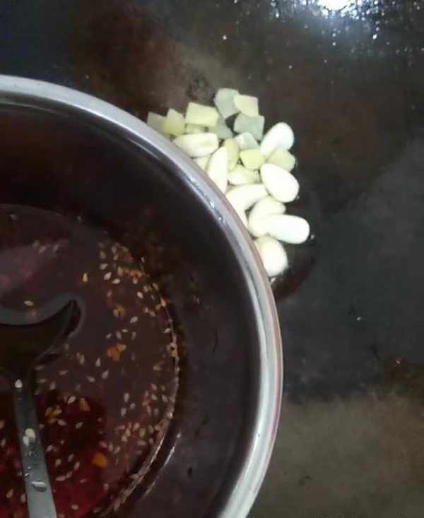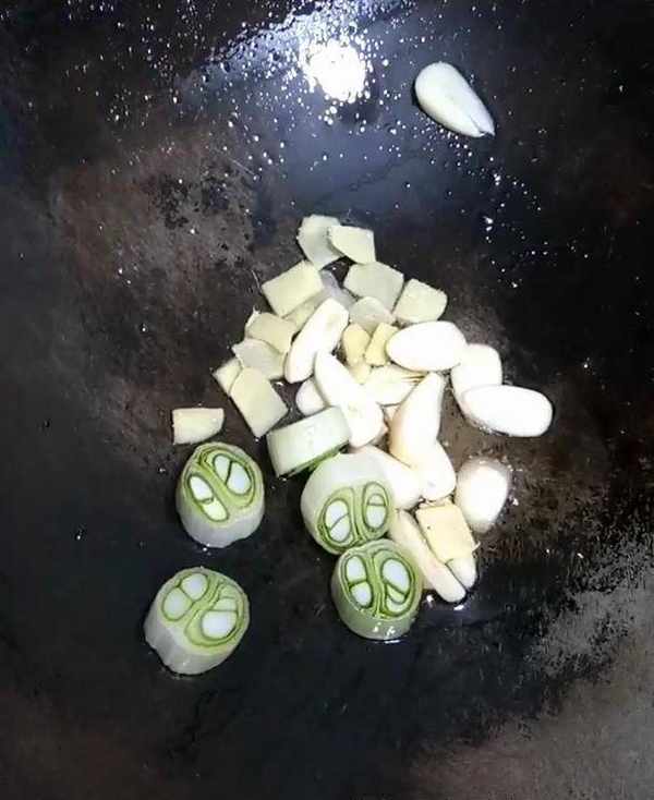 5、將炒鍋燒熱,放入一點辣椒油,放入蔥、薑、蒜炒香。