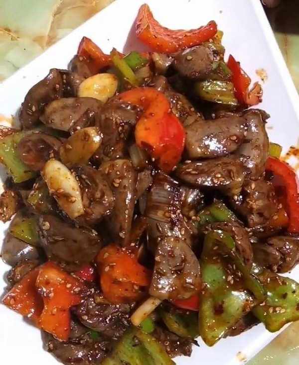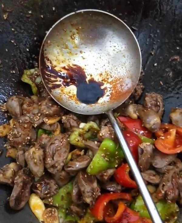 7、放入青紅辣椒和雞心,加一點生抽大火煸炒半分鐘,撒一點熟芝麻出鍋裝盤即可。