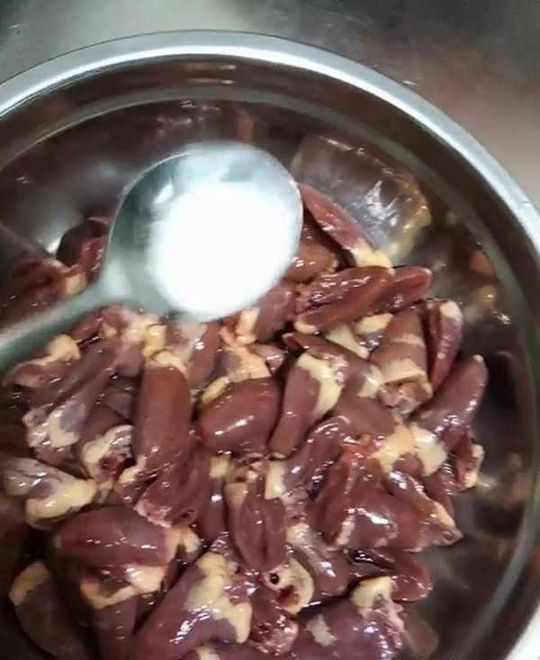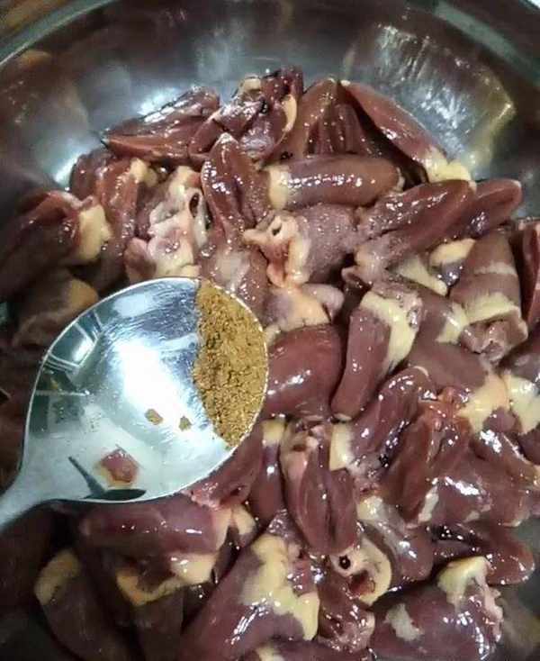 3、雞心裡加入料酒去去腥味,加入鹽、五香面醃一下。