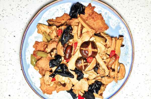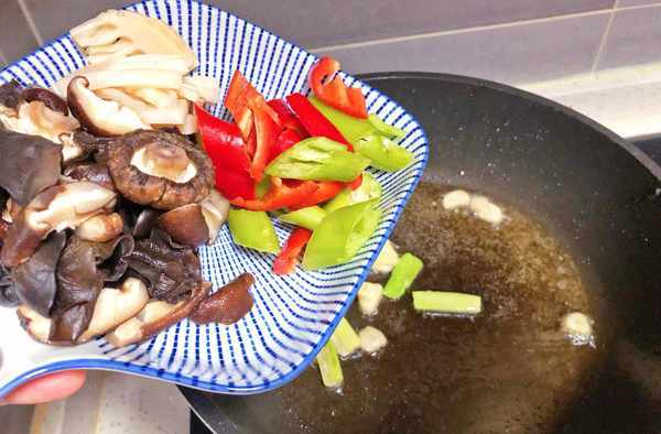 7、裡脊肉盛出後,先在鍋中下入蔥薑蒜爆香,接著再下入青紅辣椒,香菇、冬筍以及木耳,炒至斷生。