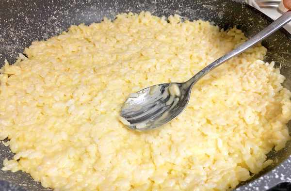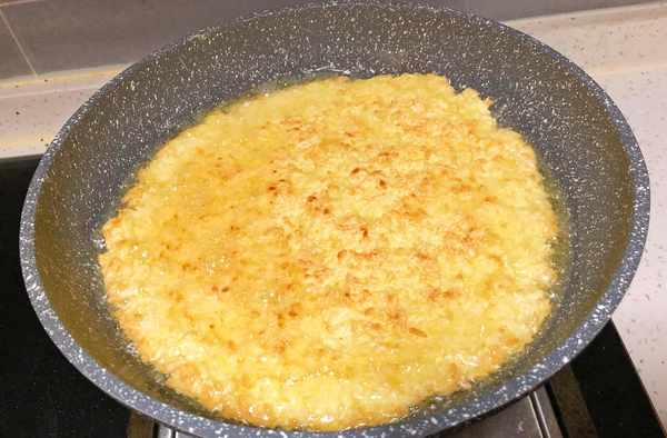 2、起鍋不放油,調小火,把攪拌好的米飯平鋪在平底鍋內,烙至一面定型後再翻面繼續烙,直到把鍋巴中的水分烙幹,兩面定型後再盛出。
