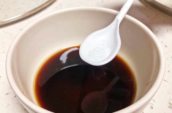 4、鍋巴煎好後,開始調料汁,料汁中包括2勺生抽、2勺白糖、1勺雞汁(可不放)、1勺料酒以及半勺鹽,把這些全部倒入碗中後,攪拌均勻備用。
