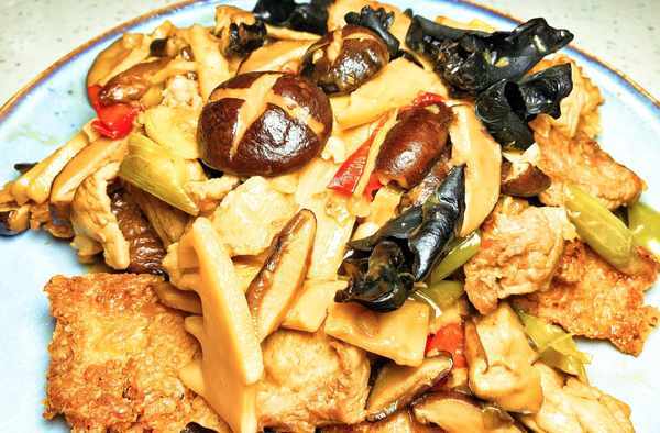 輔料:大蔥1小段、生薑1片、大蒜4瓣、雞蛋2枚、青辣椒半根、紅辣椒半根、香菇6朵、冬筍120g、木耳8朵