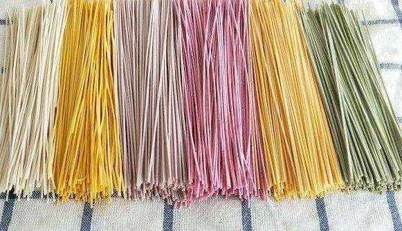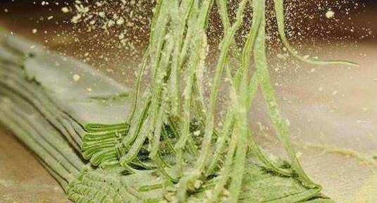 將壓得很輕的面團放入面團機中,以第一檔不停地搟,直到面團成型,將面條機機轉到二檔和三檔,重復至少滾5次,然後打開開關,面條就源源不斷的出來瞭,然後我們把面條切成我們想要的長度,上面撒上一層面粉,掛在一個相對陰涼幹燥的地方,讓水分自然地去除。這個步驟大約需要5到6個小時,等到面條幹燥好之後我們可以保存很久,放在一起個幹凈的紙上,什麼時候想吃都可以。