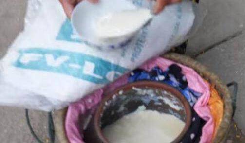 大媽賣的是豆腐腦。豆腐腦和豆花都是做豆腐的中間產物,成分上並沒有太大區別。豆腐腦是最先出來的,比較嫩軟,用筷子難以夾起,需用湯勺盛用;等到豆腐腦再凝固一點,就是豆花,與豆腐腦相比口感凝滑,可以用筷子夾起來吃;豆花放入模具裡面壓實更加凝固之後就是豆腐瞭。