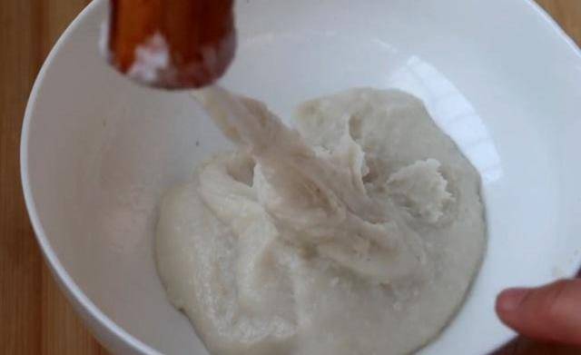 2.糯米蒸熟後倒入碗中,用搟面杖不停敲打成細膩拉絲,喜歡甜一點口味的可以趁熱放適量糖再打。