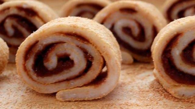 6.上面塗抹上適量紅豆沙,然後從一邊往上卷起來,卷的時候要緊實一些,再切成兩指寬的小塊即可。