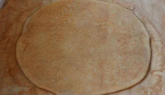 5.接著將打好的糯米倒在黃豆粉上,在糯米上面也倒一些黃豆粉,再用搟面杖搟成圓形薄片。