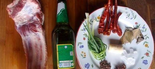 1、首先準備食材:排骨、啤酒、蔥、薑、花椒、八角、香葉、幹辣椒、冰糖等各適量備用;
