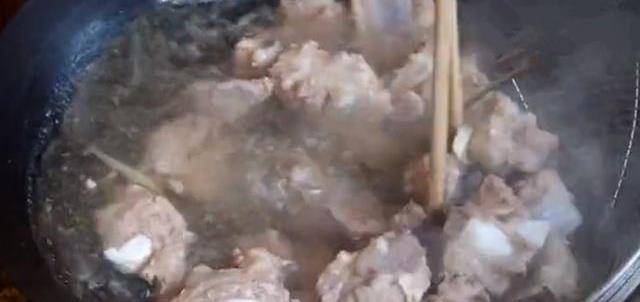4、起鍋放入清水,然後冷水將排骨下鍋,放入些生薑、適量的料酒,然後開火煮開持續5分鐘,將面上的浮末撇去後撈出來瀝幹水份後備用;